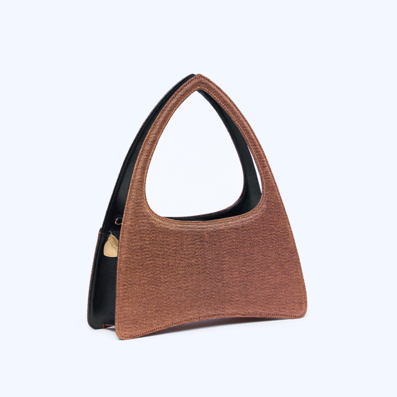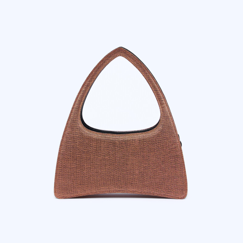"Ellie" Triangle handbag, made of fabric with intertwined copper threads and suede details. Handmade closure with 3-micron gold plating.