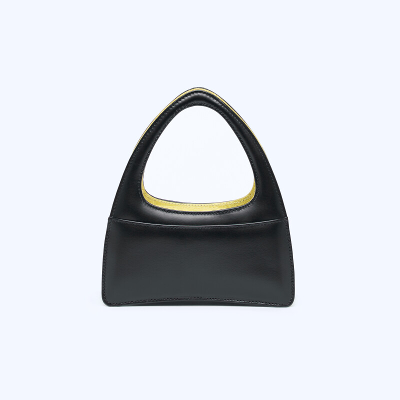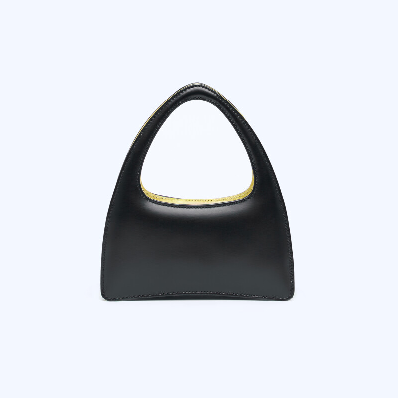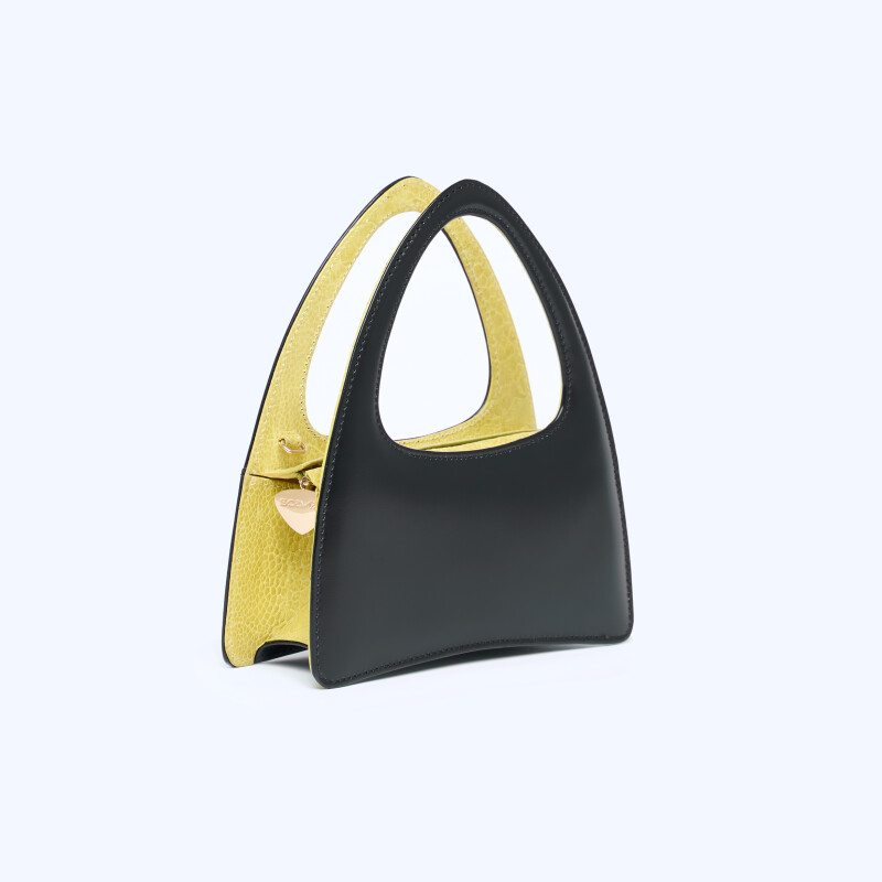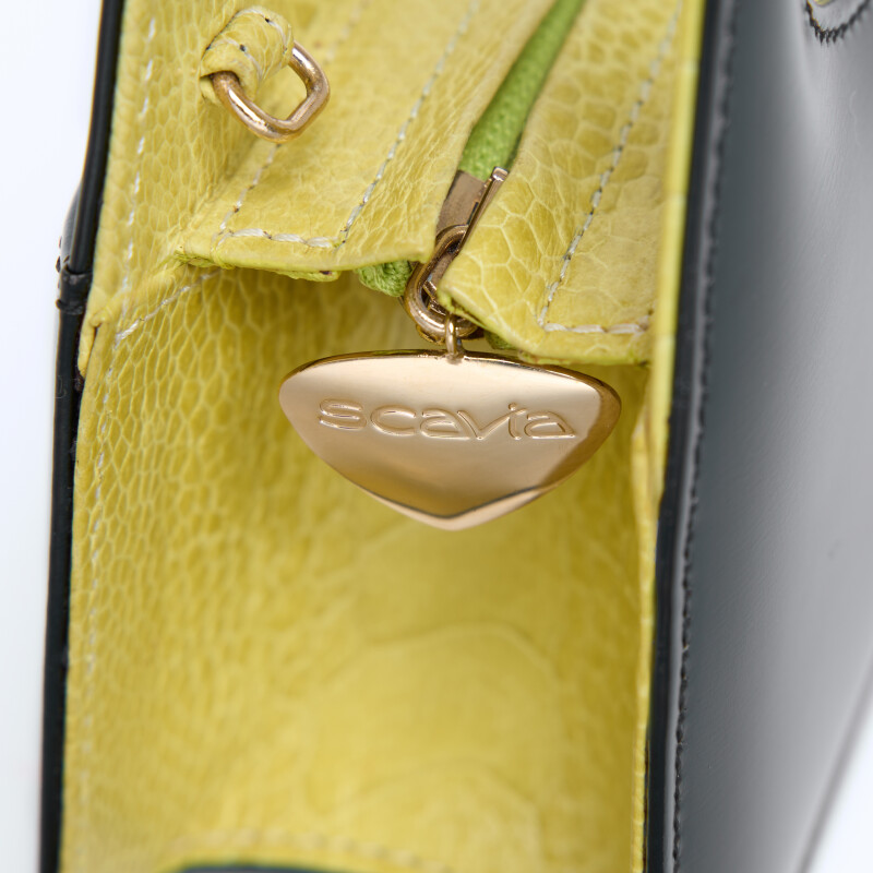 "Ellie" Triangle handbag, made of fine calfskin and ostrich leg. Handmade closure with 3-micron gold plating.
