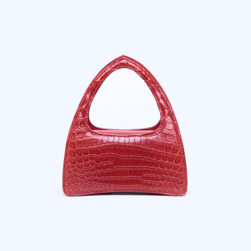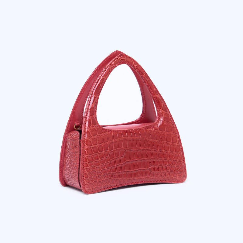 "Ellie" Triangle handbag, made of fine crocodile leather and calfskin. Handmade closure with 3-micron gold plating.
