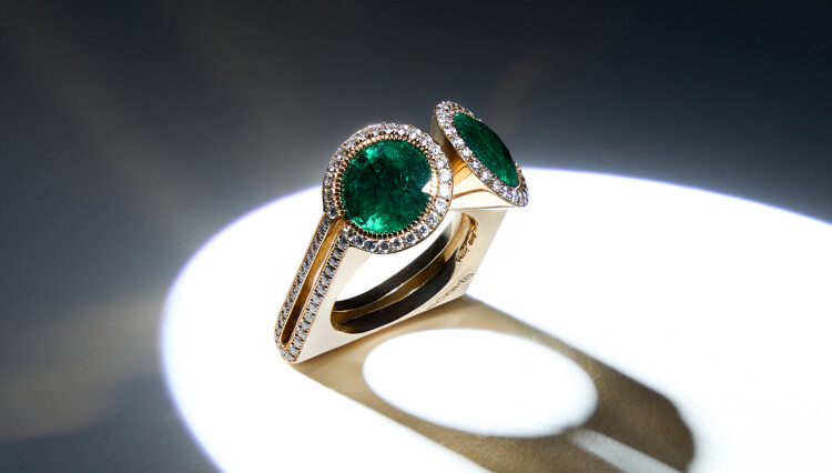 Due smeraldi tondi abbracciati da una rigorosissima geometria d’oro giallo per questo anello vincitore del “Diamond International Awards”.
