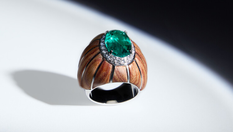 L’incontro tra il legno “bois de rose” e uno smeraldo colombiano di 4,7 carati crea quella “sorpresa” che cercavi in un anello.