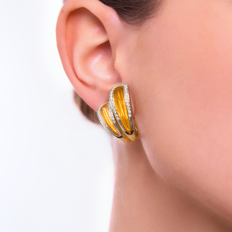 Realizzati in oro bianco e giallo 18kt, diamanti bianchi taglio brillante di alta qualità e intarsio di Quarzo Citrino.