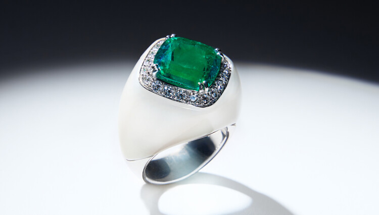 The encounter of the white of fossil ivory with the pure green of this Colombian emerald cushion of more than 8 carats is now a classic SCAVIA high jewellery.