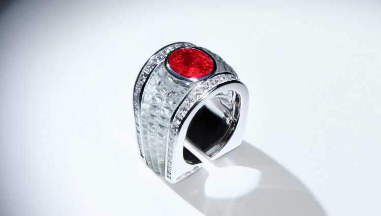 This ring is born from a gesture of white gold, diamonds and hyaline quartz which holds an extraordinary beautiful Burmese ruby of over 5 carats.