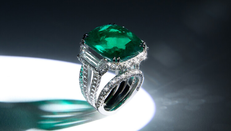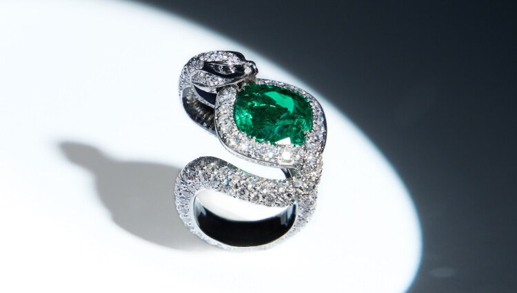 A symbol of seduction, where the exotic elegance of jewellery becomes an experience, whispering mystery and allure. An enchanting emerald, cradled by the scintillating embrace of diamonds, capturing the very essence of sophistication and desire.