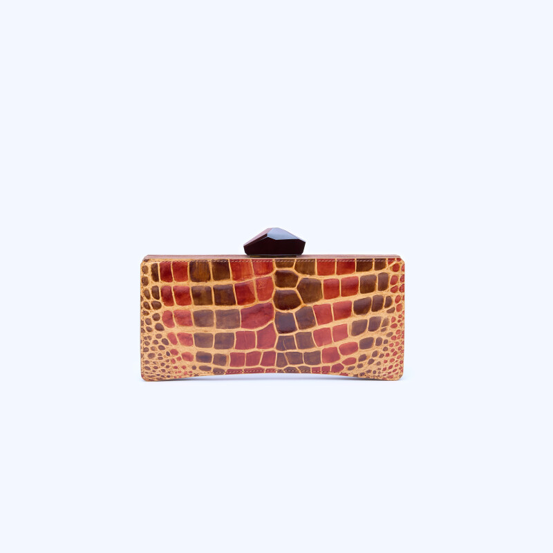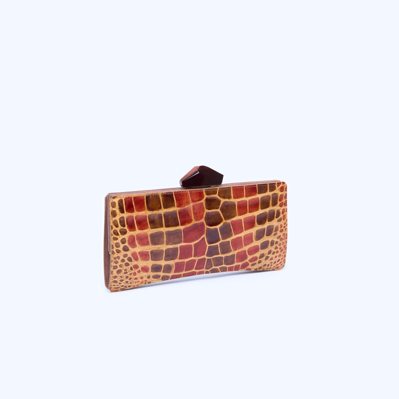 "Pochette Ashley Cigarette Arlequin, un'esclusiva creazione realizzata con maestria utilizzando pregiata pelle di Alligatore, dipinta a mano per un tocco unico e pulsoir in pietra di falcon eye."