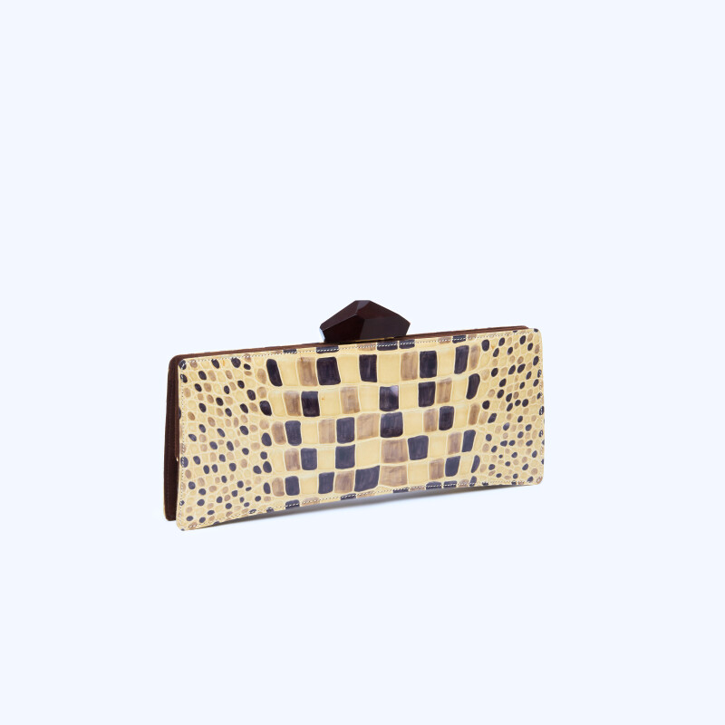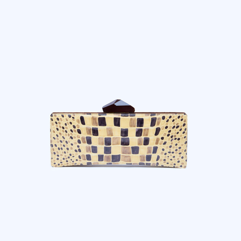 "Pochette Ashley Cigarette Arlequin, un'esclusiva creazione realizzata con maestria utilizzando pregiata pelle di Alligatore, dipinta a mano per un tocco unico e pulsoir in pietra di falcon eye."
