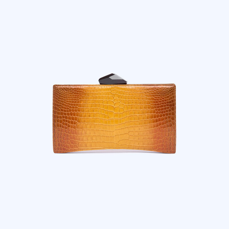 "Pochette Ashley, realizzata in pregiata pelle di Coccodrillo con pulsoir in pietra di falcon eye."