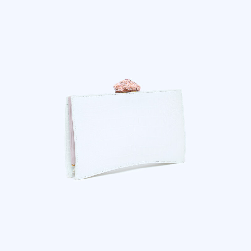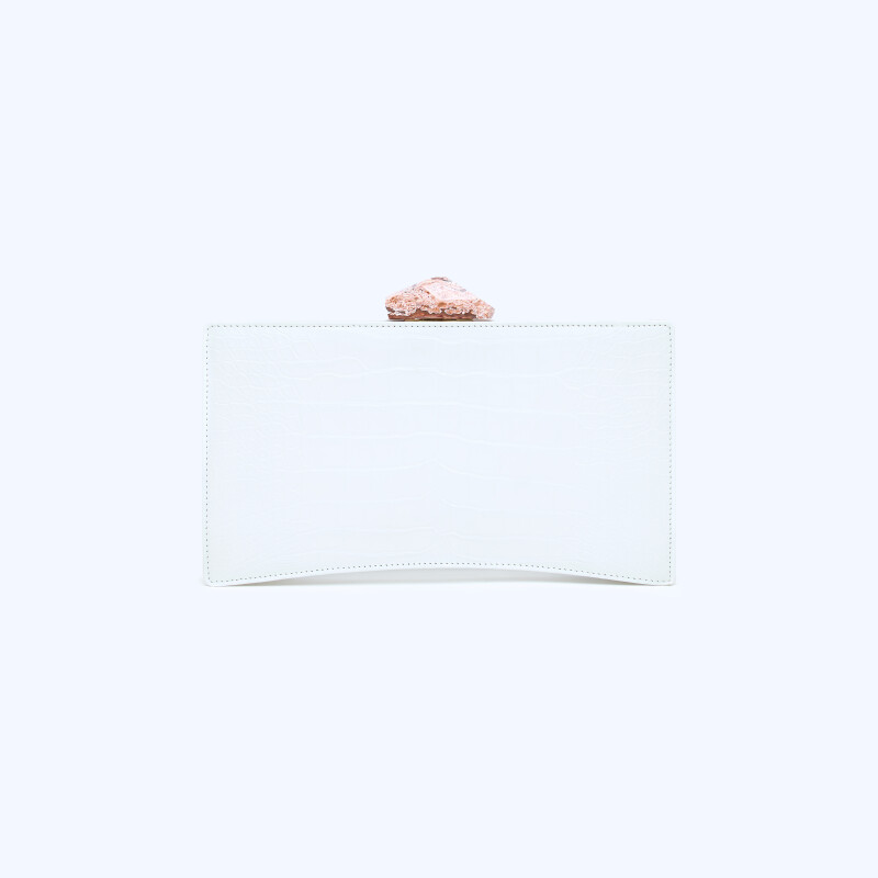 "Pochette Ashley, realizzata in pregiata pelle di alligatore con pulsoir in pietra di tufo lava."
