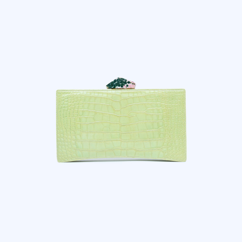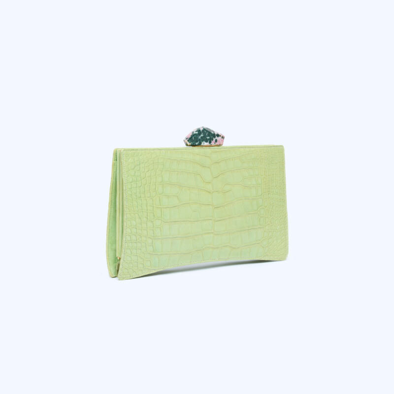 "Pochette Ashley, realizzata in pregiata pelle di alligatore con pulsoir in pietra di diasporo orbicolare."