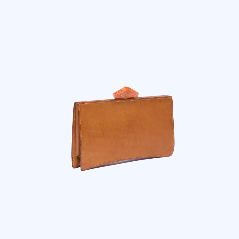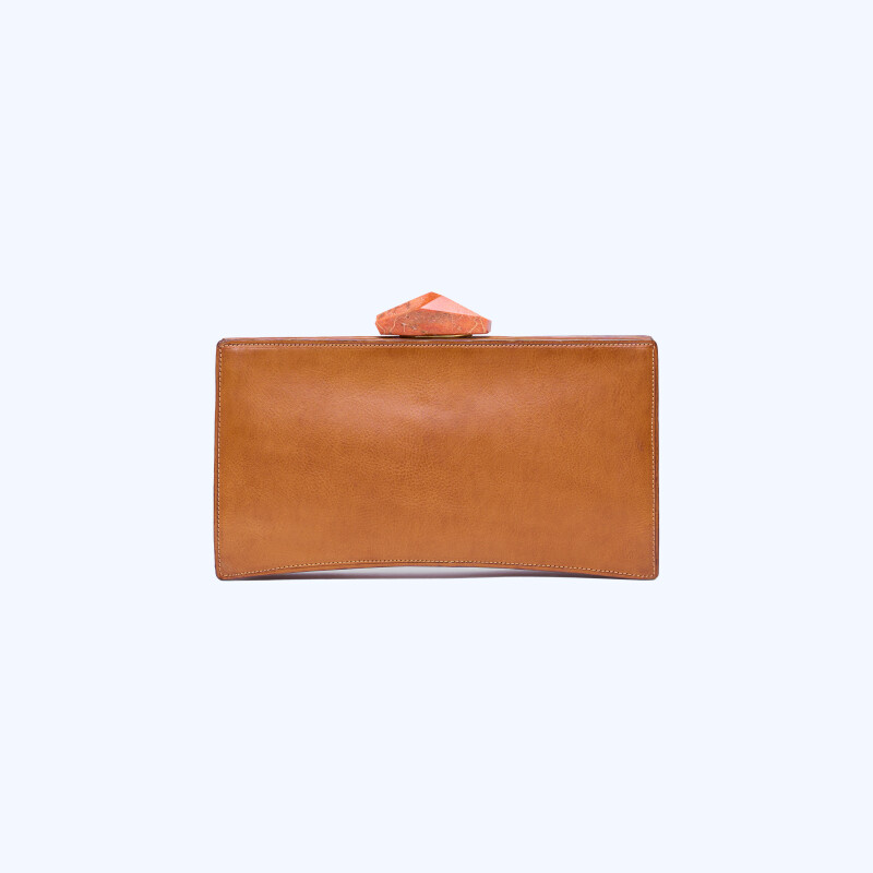 "Pochette Ashley, realizzata in pelle di cuoio con pulsoir in corallo naturale."