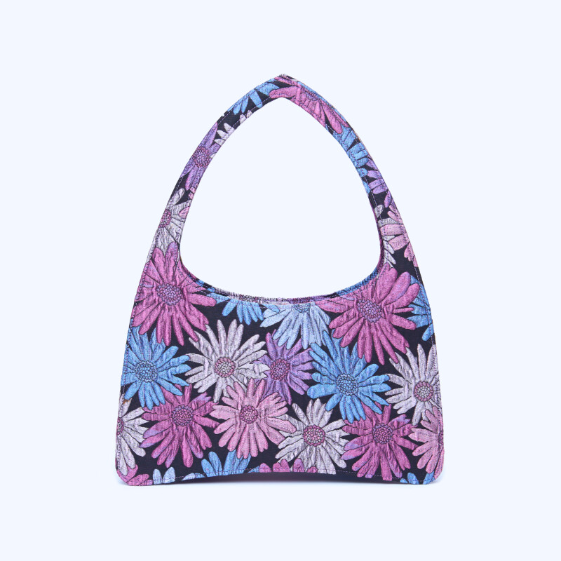 Borsa a mano "Ellie" flowers, fa parte della nostra collezione limitata, realizzata con pregiato tessuto floreale lilla. Chiusura realizzata artigianalmente in 3 micron d’oro giallo.