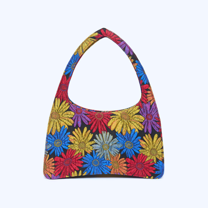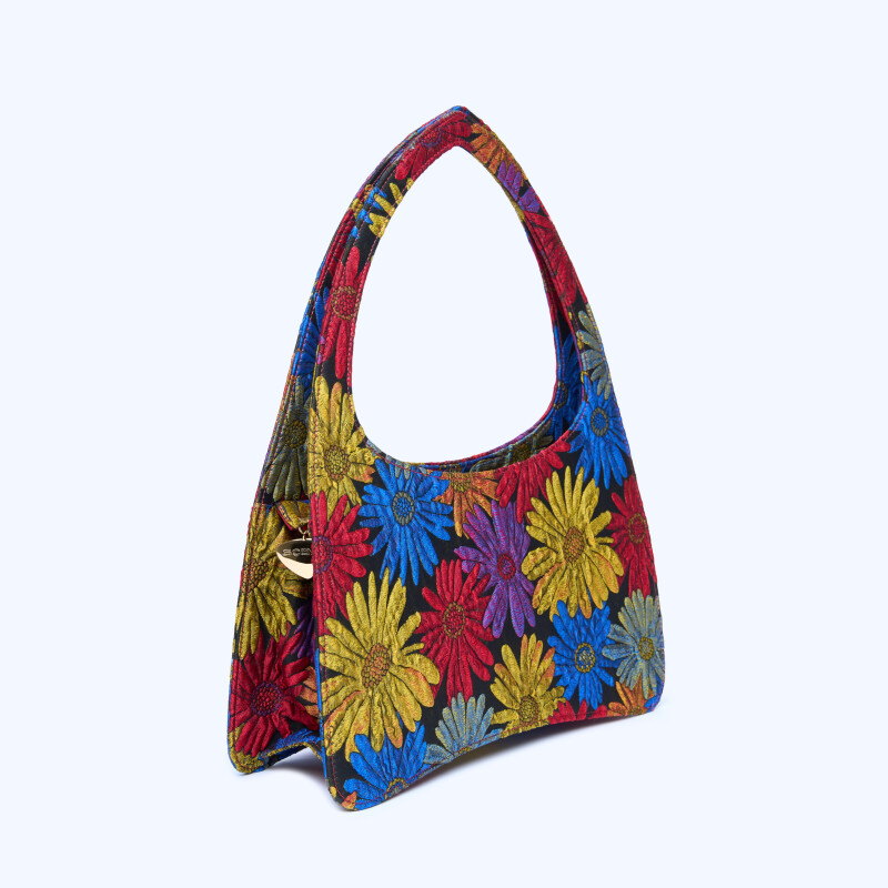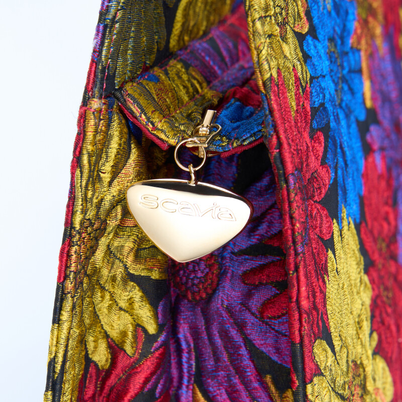 Borsa a mano "Ellie" flowers, fa parte della nostra collezione limitata, realizzata con pregiato tessuto floreale rosso. Chiusura realizzata artigianalmente in 3 micron d’oro giallo.