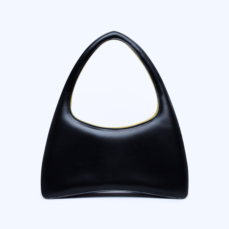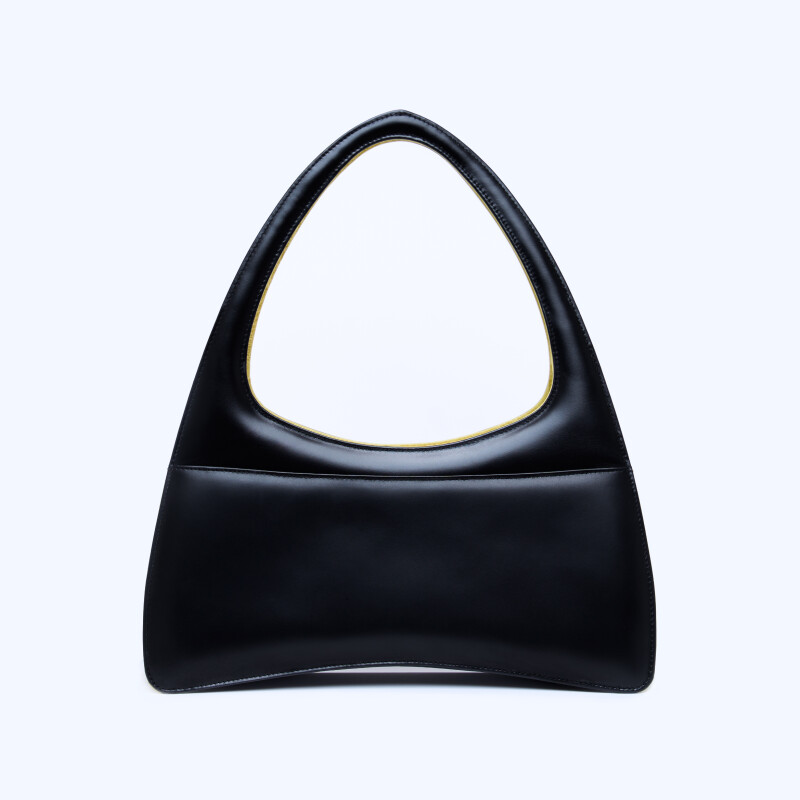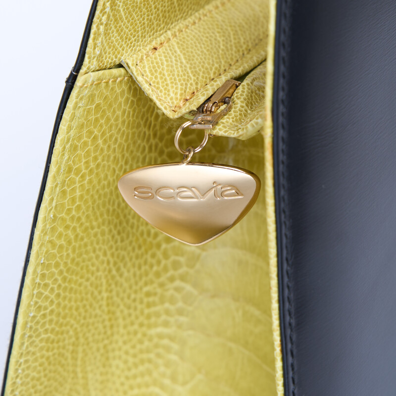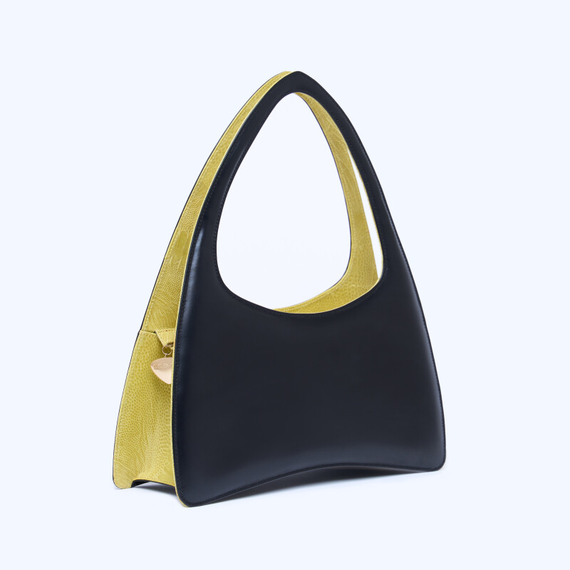Borsa a mano Ellie Triangle, realizzata in pregiata pelle di vitello e zampa di struzzo. Chiusura realizzata artigianalmente con finitura in 3 micron d’oro giallo.