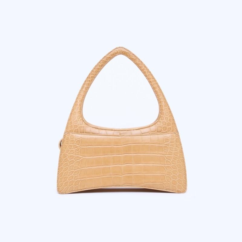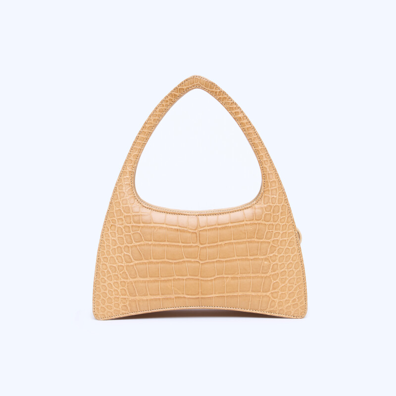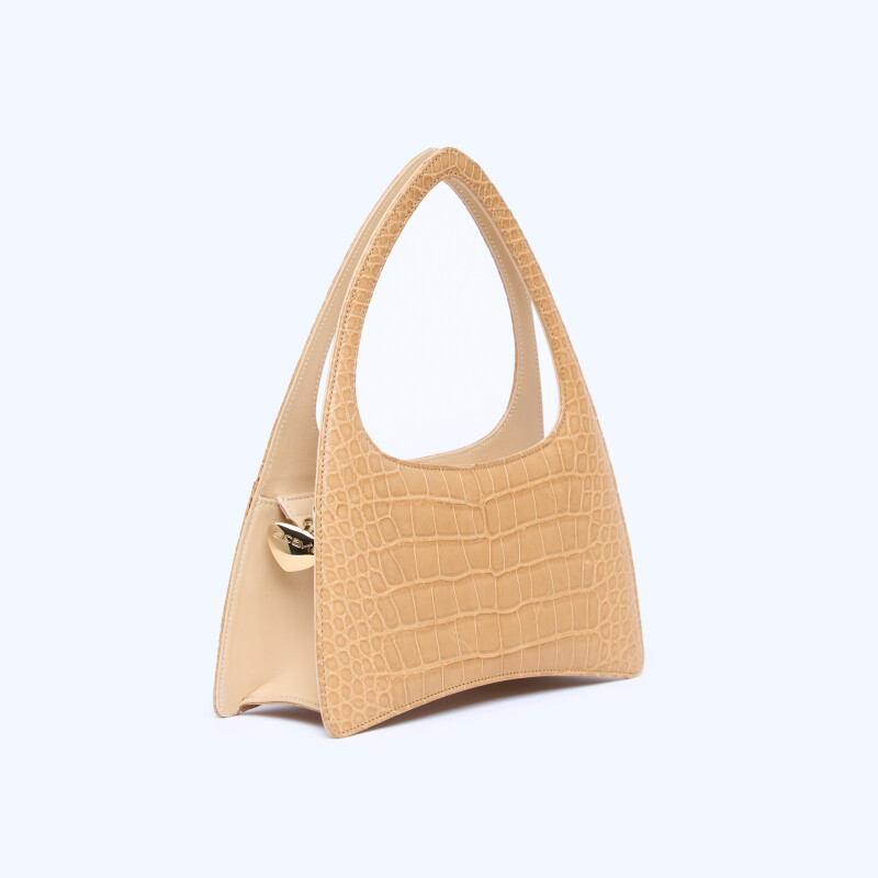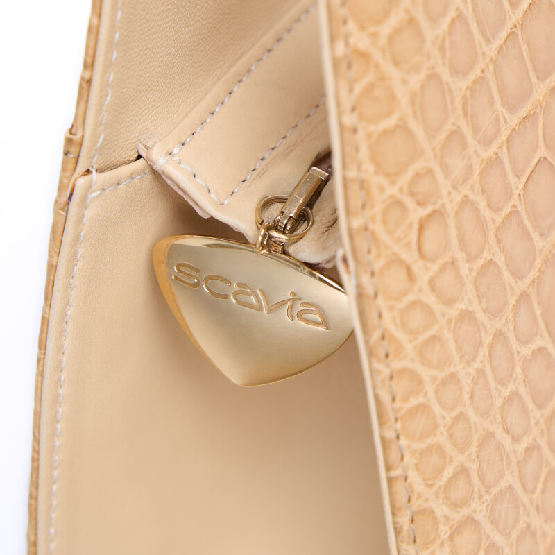 Borsa a mano Ellie Triangle, realizzata in pregiata pelle di alligatore e vitello. Chiusura realizzata artigianalmente in 3 micron d’oro giallo.