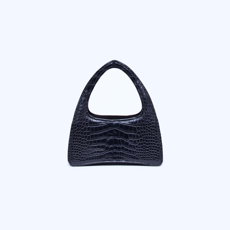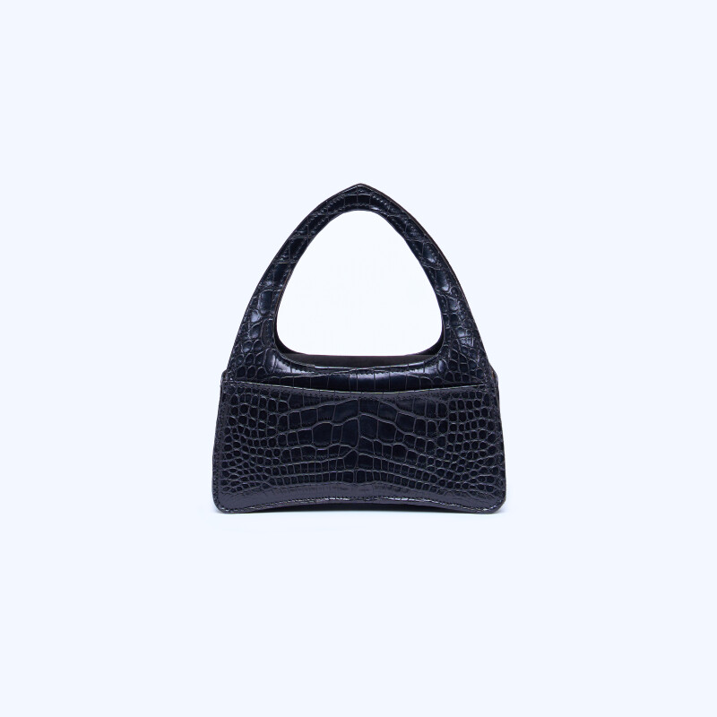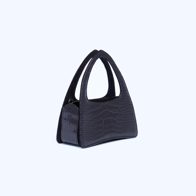 Borsa a mano Ellie Triangle, realizzata in pregiata pelle di Alligatore con dettagli in camoscio. Chiusura realizzata artigianalmente in 3 micron d’oro giallo.