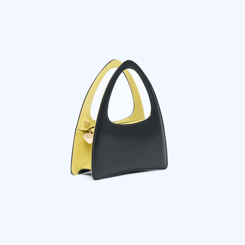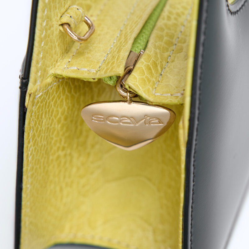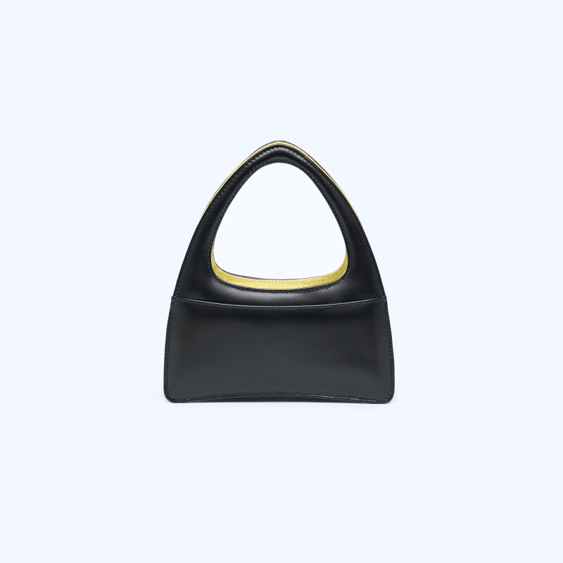 Borsa a mano Ellie Triangle, realizzata in pregiata pelle di vitello e zampa di struzzo. Chiusura realizzata artigianalmente in 3 micron d’oro giallo.
