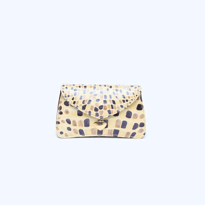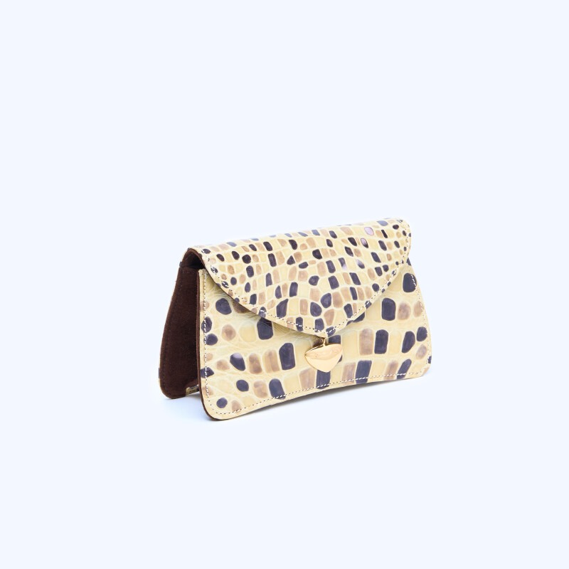 Pochette "Ellie" Arlequin, un'esclusiva creazione realizzata con maestria utilizzando pregiata pelle di Alligatore e dettagli in pelle di camoscio, dipinta a mano per un tocco unico. Chiusura realizzata artigianalmente in 3 micron d’oro giallo.