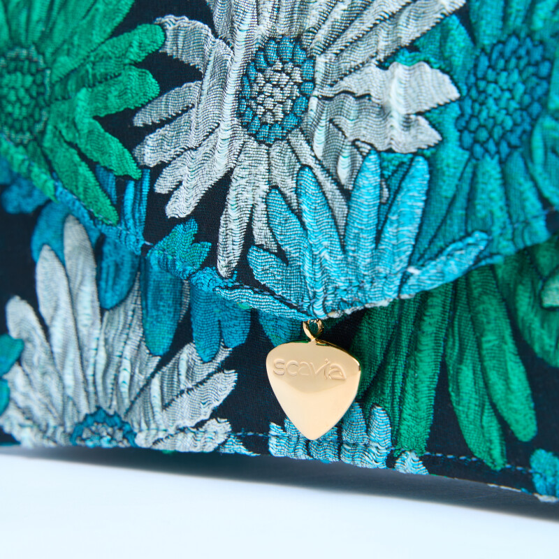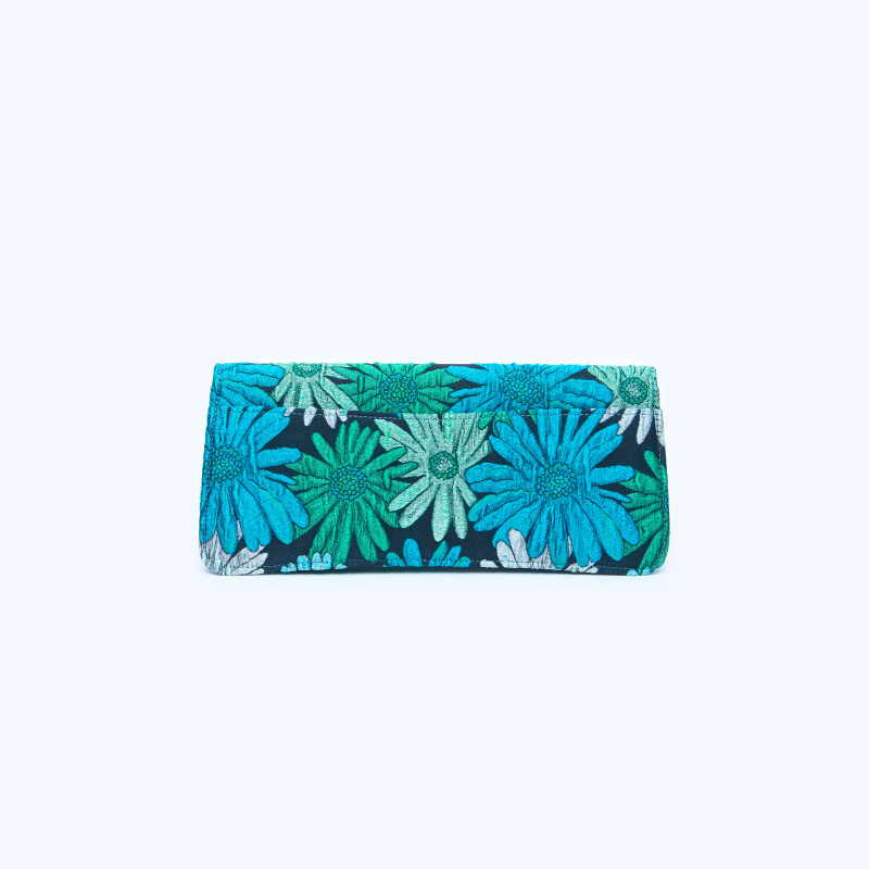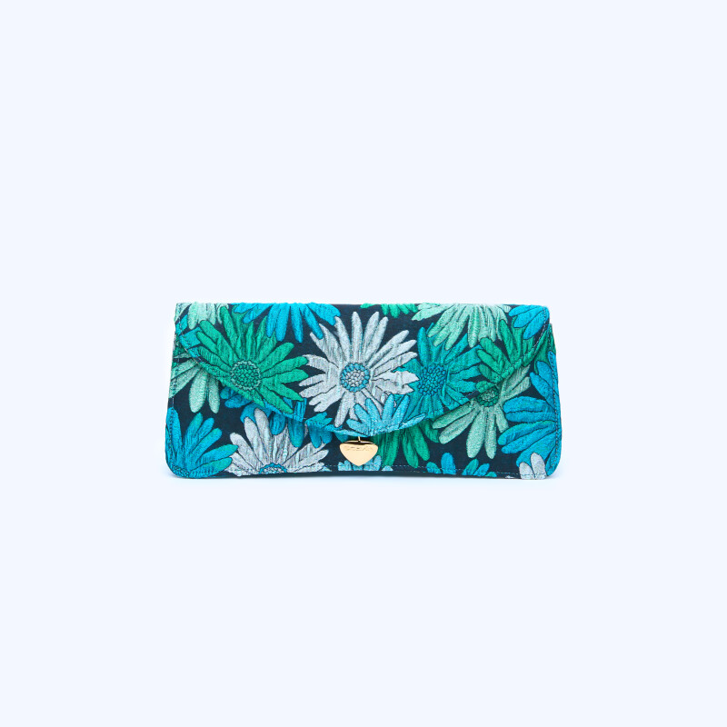 Pochette "Ellie" cigarette flowers, fa parte della nostra collezione, limitata realizzata con pregiato tessuto floreale verde. Chiusura realizzata artigianalmente in 3 micron d’oro giallo.