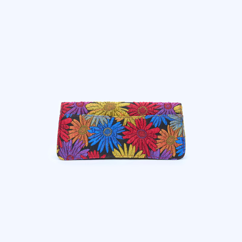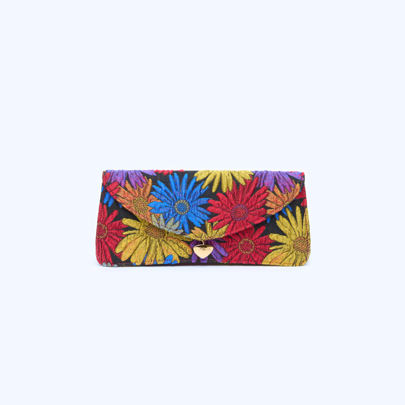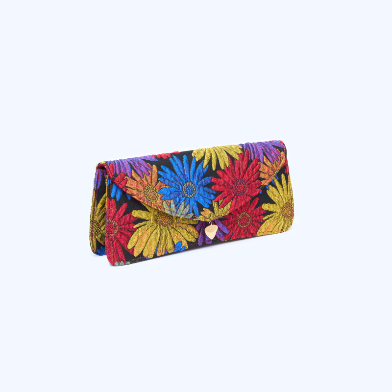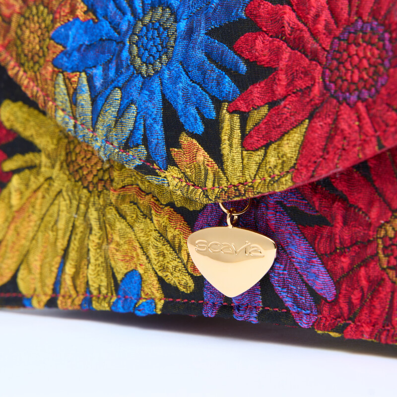 Pochette "Ellie" cigarette flowers, fa parte della nostra collezione limitata, realizzata con pregiato tessuto floreale rosso. Chiusura realizzata artigianalmente in 3 micron d’oro giallo.