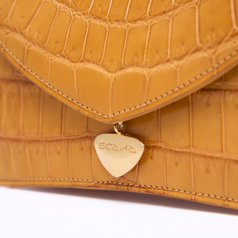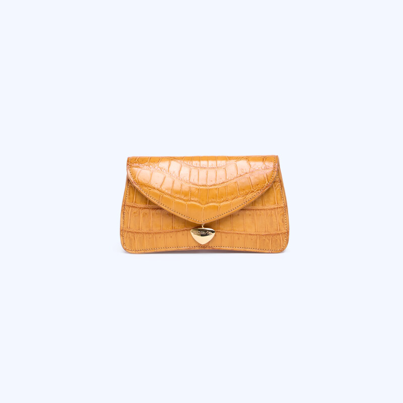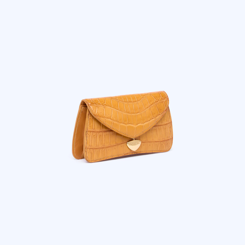 Pochette Ellie, realizzata in pregiata pelle di Coccodrillo. Chiusura realizzata artigianalmente in 3 micron d’oro giallo.