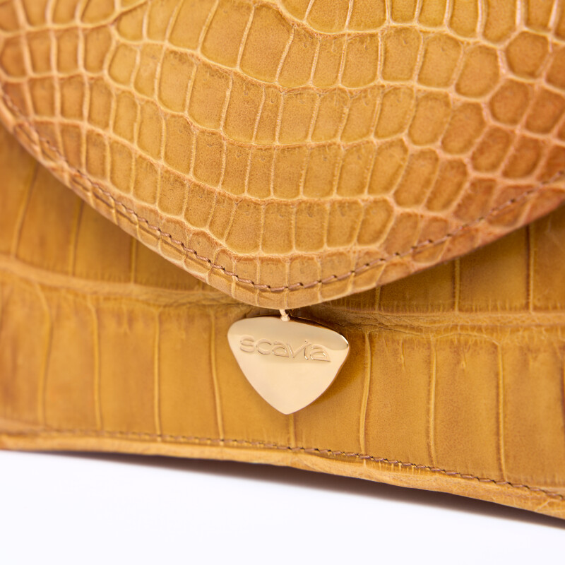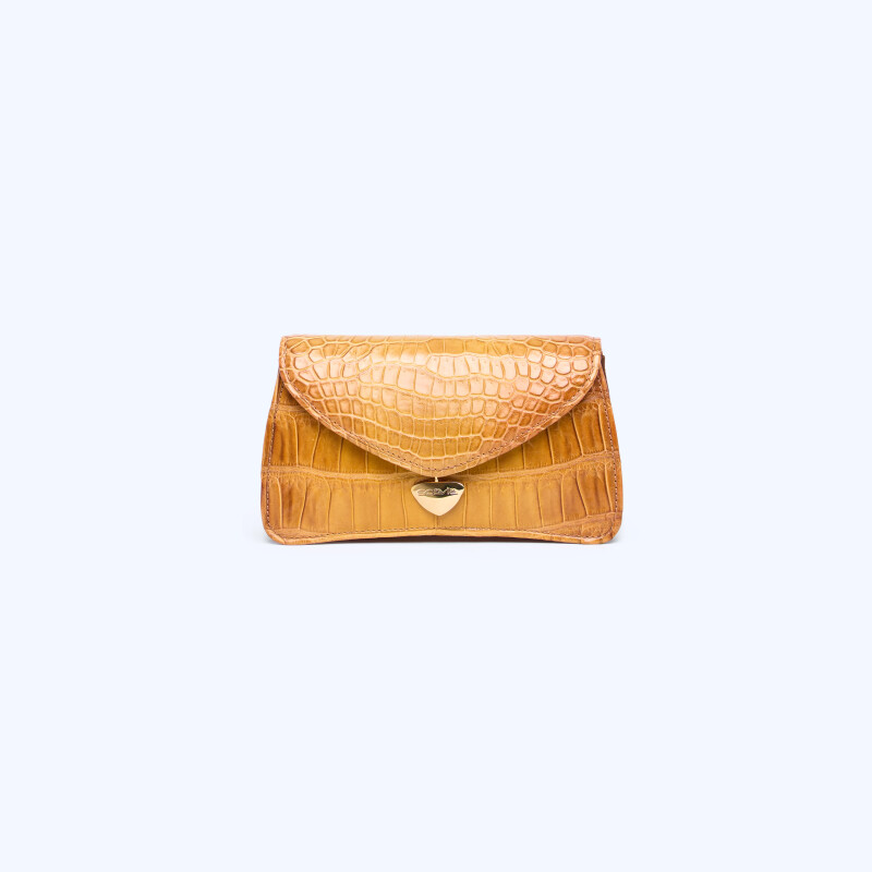 Pochette Ellie, realizzata in pregiata pelle di Coccodrillo. Chiusura realizzata artigianalmente in 3 micron d’oro giallo.
