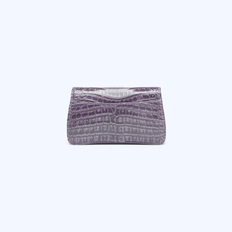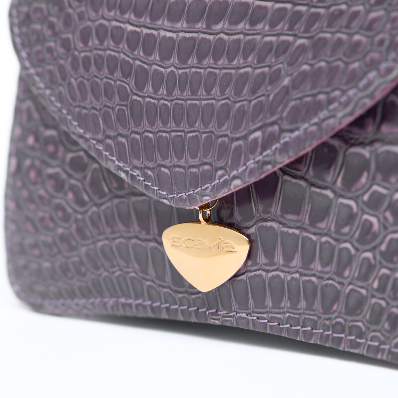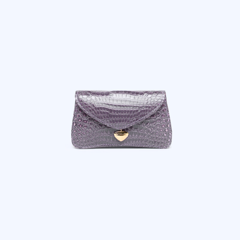 Pochette Ellie, realizzata in pregiata pelle di Alligatore. Chiusura realizzata artigianalmente in 3 micron d’oro giallo.