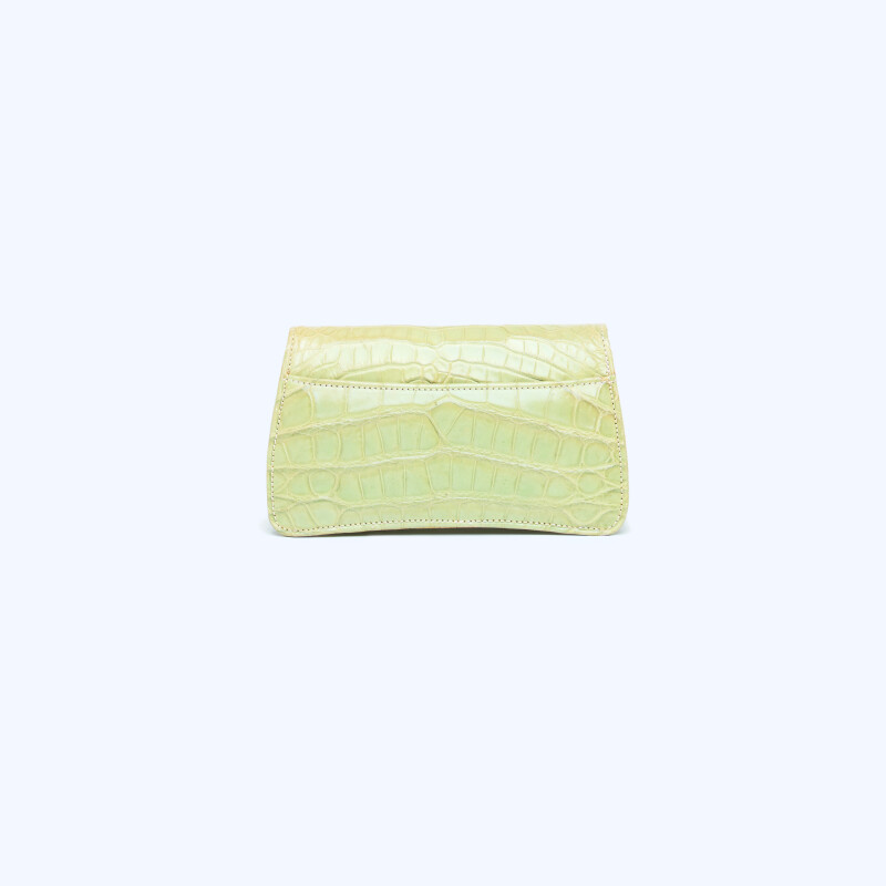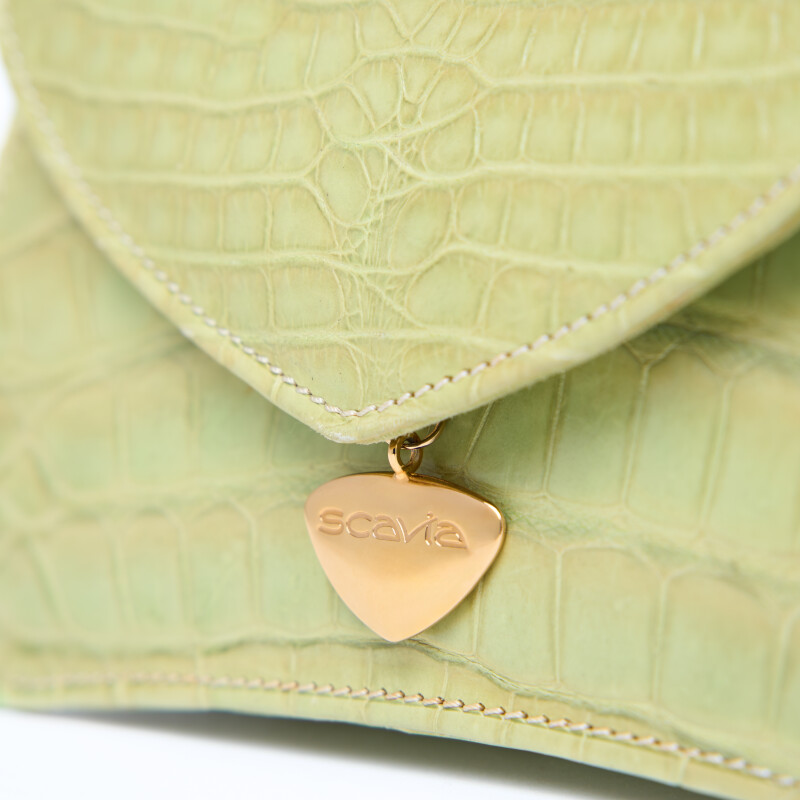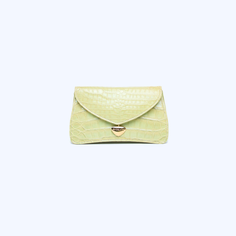 Pochette "Ellie", realizzata in pregiata pelle di Alligatore. Chiusura realizzata artigianalmente in 3 micron d’oro giallo.