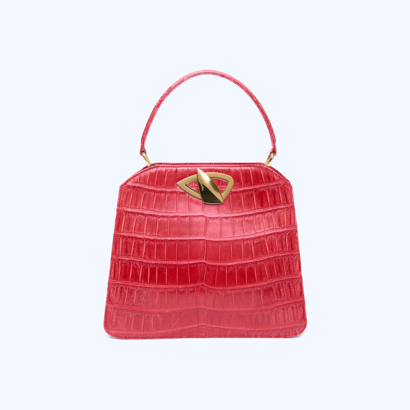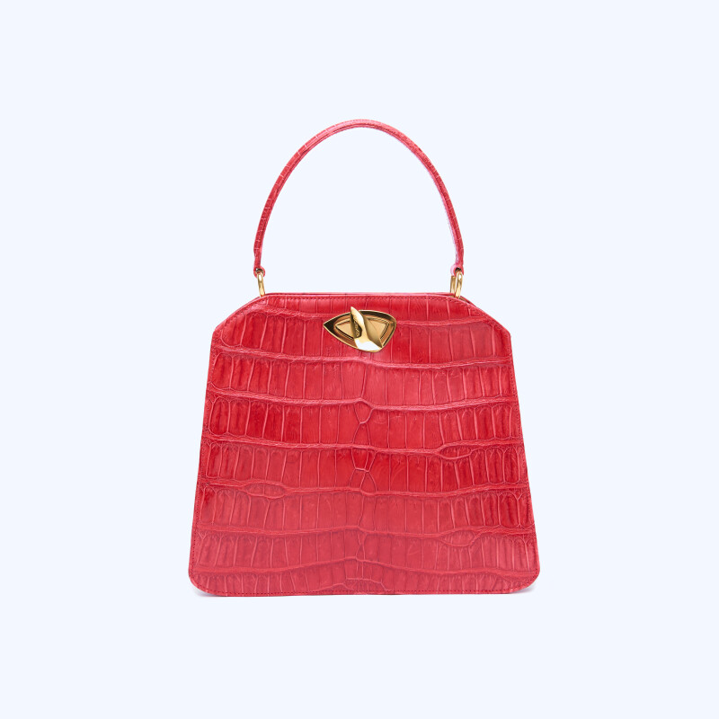 "Borsa a mano Jacqueline, realizzata in pregiata pelle di coccodrillo. Chiusura realizzata artigianalmente con finitura in 3 micron d’oro giallo."