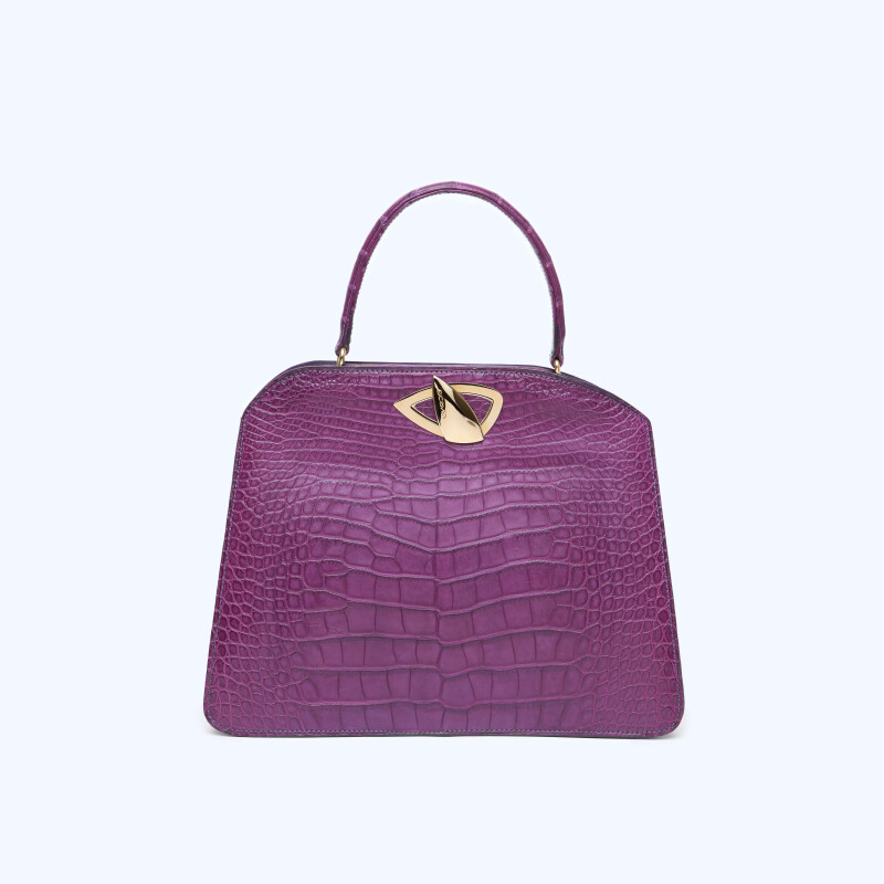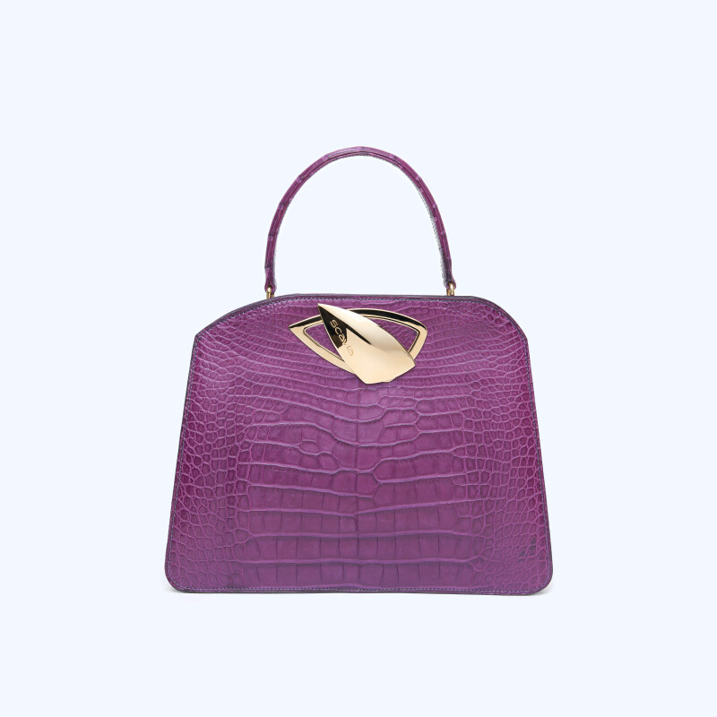 "Borsa a mano Jacqueline, realizzata in pregiata pelle di Alligatore. Chiusura realizzata artigianalmente in 3 micron d’oro giallo."