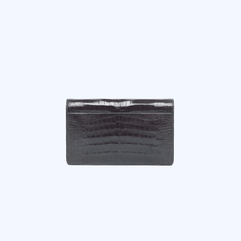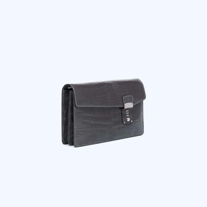 "Borsa a mano da uomo a tre sezioni, realizzata in pelle di coccodrillo e vitello, con chiusura a pressione e combinazione rifinita in 3 micron palladio."