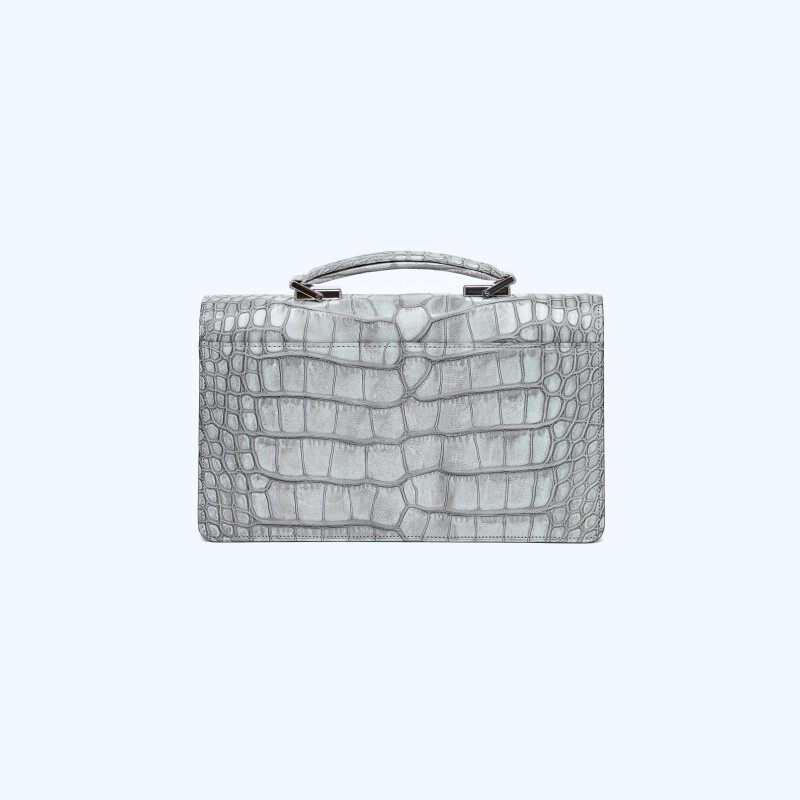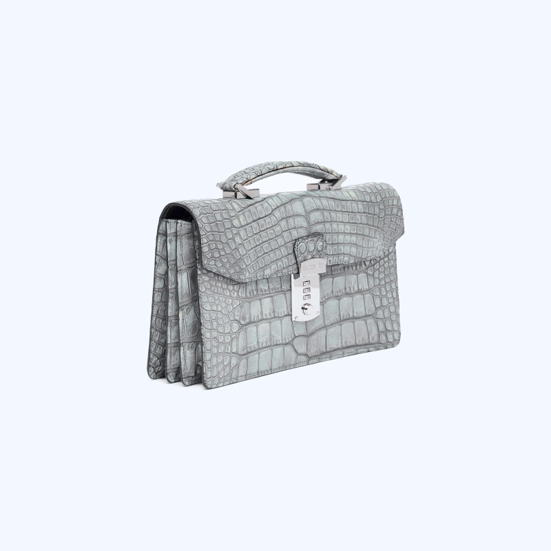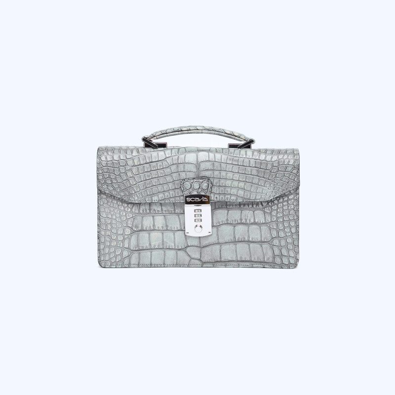 "Borsa a mano da uomo con tre sezioni, realizzata in pregiata pelle di alligatore, con chiusura a pressione e combinazione rifinita in 3 micron palladio."