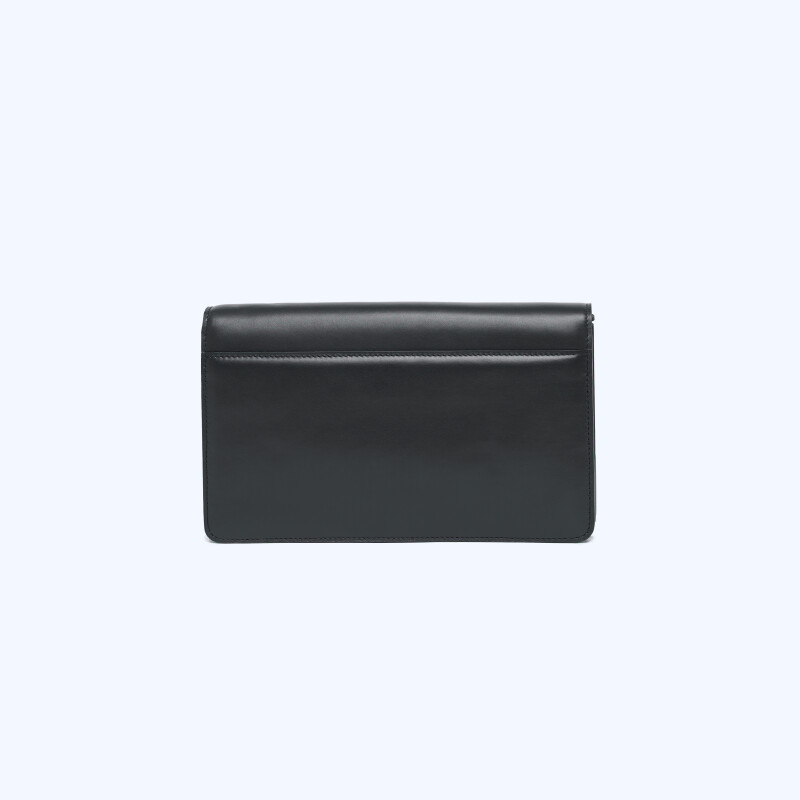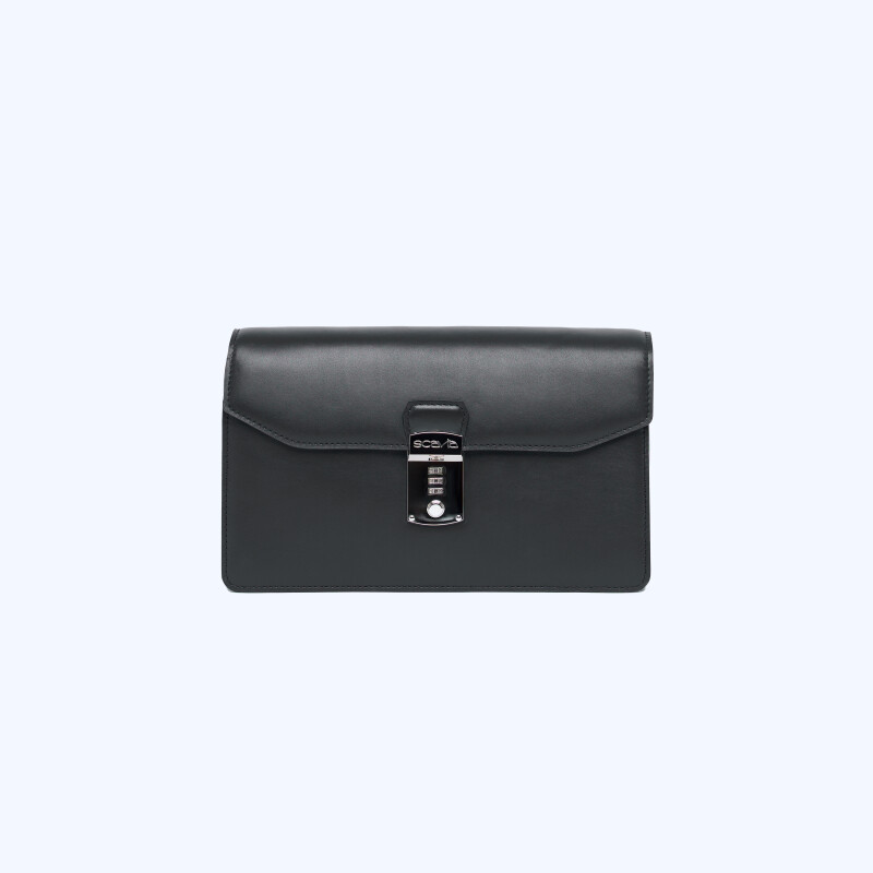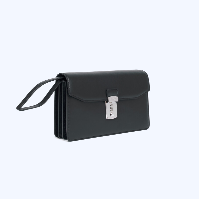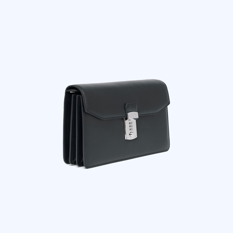 "Borsa a mano da uomo a tre sezioni, realizzata in pelle di vitello, con chiusura a pressione e combinazione rifinita in 3 micron palladio."