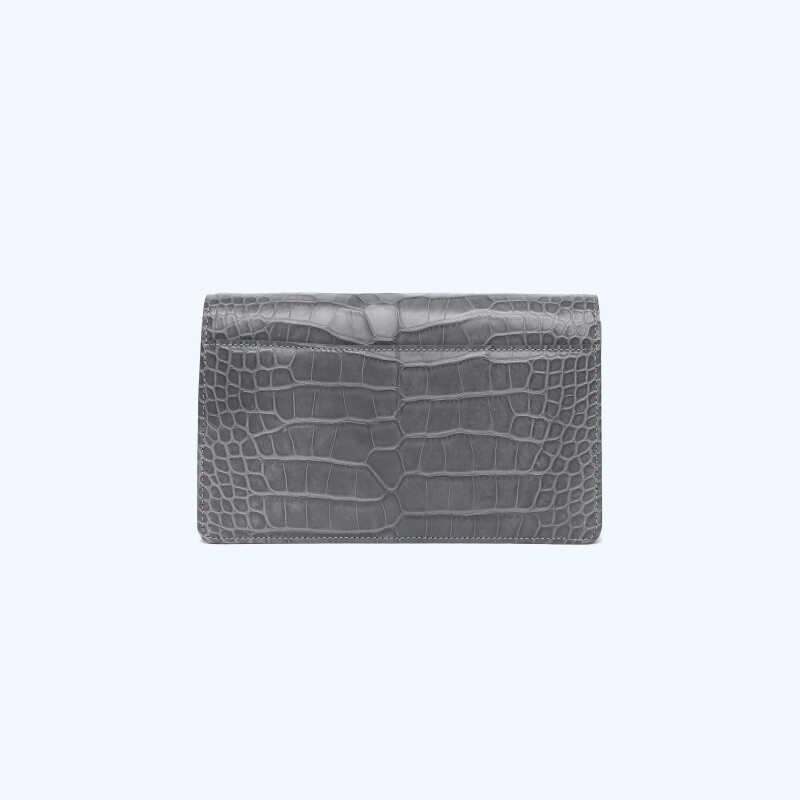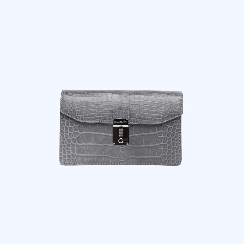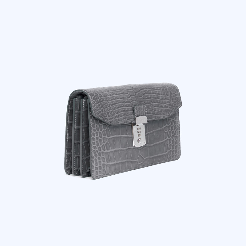 "Borsa a mano da uomo a tre sezioni, realizzata in pregiata pelle di alligatore, con chiusura a pressione e combinazione rifinita in 3 micron palladio."
