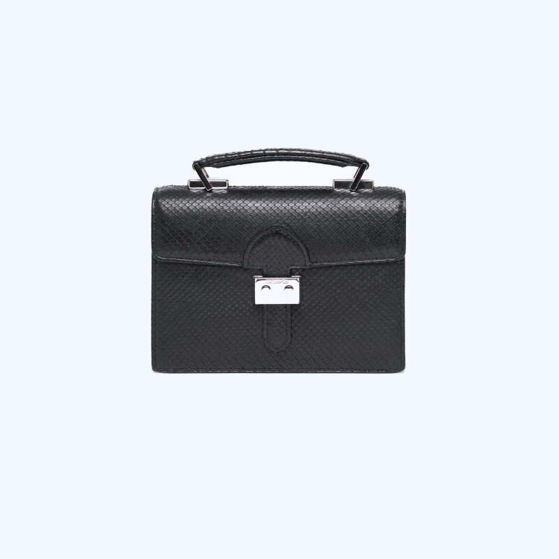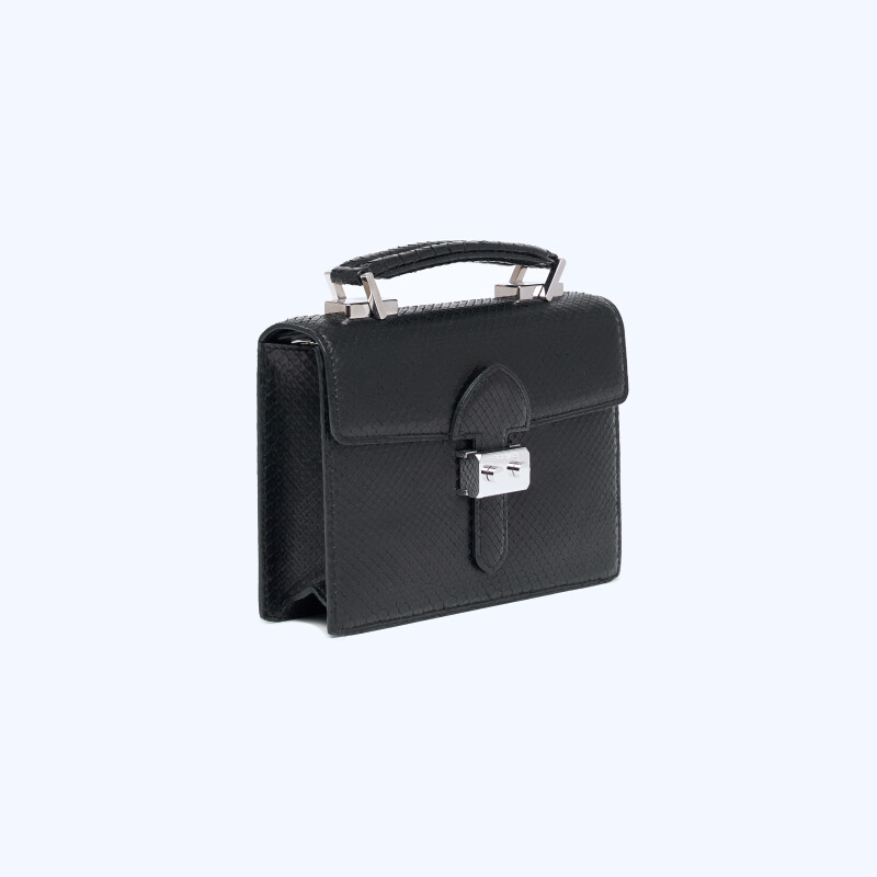 "Borsa a mano da uomo a due sezioni, realizzata in pelle di pitone e Vitello, con chiusura a pressione rifinita in 3 micron palladio."