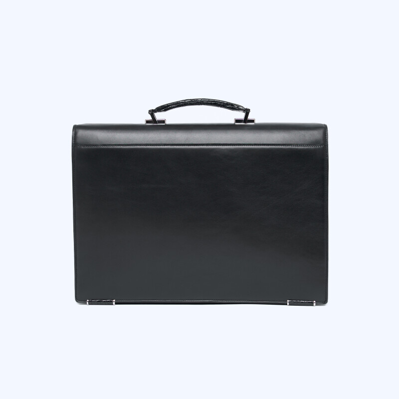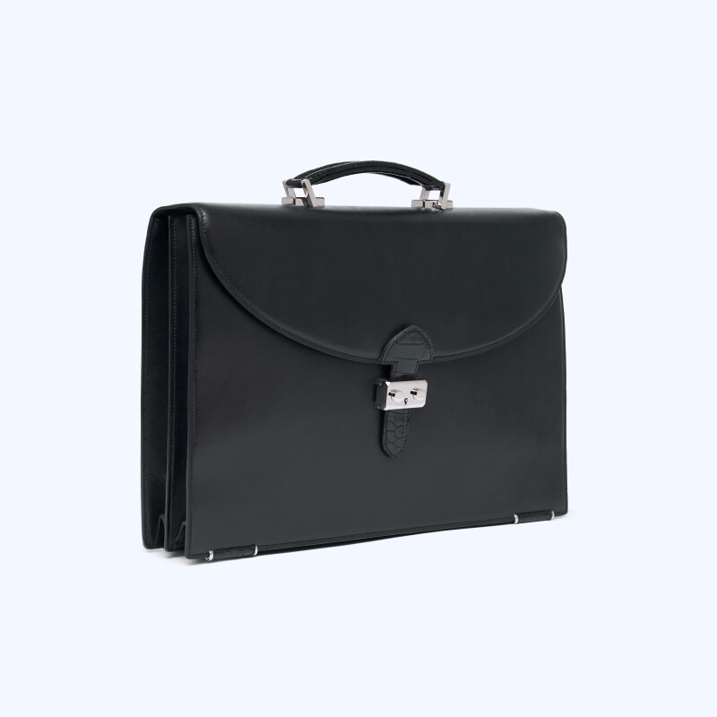 "Borsa a mano President, realizzata in pregiata pelle di vitello, con chiusura a pressione e chiave rifinita in 3 micron palladio."