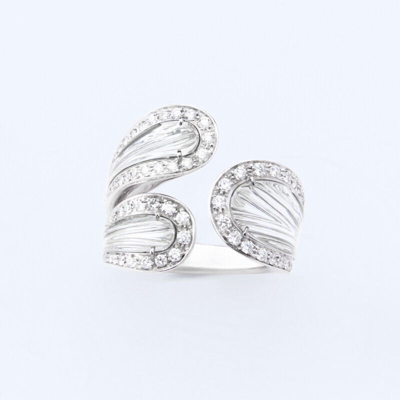 Realizzato in oro bianco 18kt, diamanti bianchi taglio brillante di alta qualità e intarsio di Quarzo Ialino.